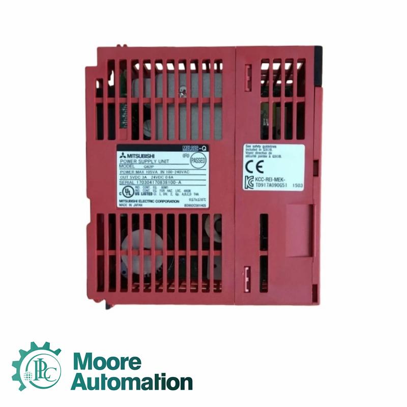 The MITSUBISHI Q62P Power Supply Module operates with an AC input range of 100–240 V, delivering stable 5 VDC and 24 VDC outputs at 3 A and 0.6 A respectively. The module features efficient energy conversion with overcurrent and overvoltage protection, ensuring reliable performance for connected devices. Compact in size, with dimensions of 55.2 × 98 × 90 mm and weighing 0.432 kg, it is suitable for installation in MELSEC-Q systems, providing continuous and stable power while maintaining low ripple voltage and effective thermal management.