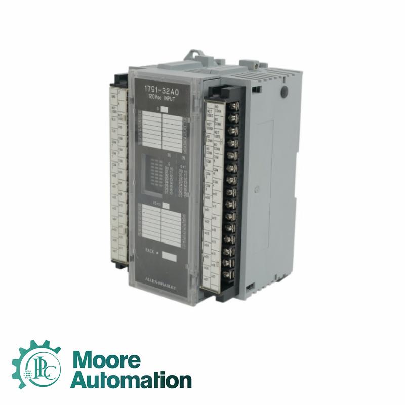 The 1791-32AO is a block I/O module. Block I/O modules are stand-alone I/O stations that is equipped with fixed I/O channels and a communication interface that support Remote I/O (RIO) communication. The 1791-32AO in particular is a Thirty-Two (32) channel block I/O module with each channel operating at a nominal input voltage of 120VAC and operating voltage range of 79-132VAC along a frequency of 47-63Hz. The input channels of the 1791-32AO are grouped into Four (4) groups with each group having Eight (8) channels each. Each input channel has a maximum Off-state voltage of 35V, minimum On-state current of 5 mA at 79V, 60 Hz and maximum On-state current of 12.3 mA @ 132VAC, 60 Hz. Each channels has switching delays of 1.0 ms for Off to On transition and maximum of 26 ms for On to Off transition. The 1791-32AO comes with a single Remote I/O (RIO) communication port with isolation rating of 1250 VAC for I/O group to group isolation and 1250 VAC I/O group to logic isolation. Additionally, the Power supply to RIO port isolation is 500 VAC. |